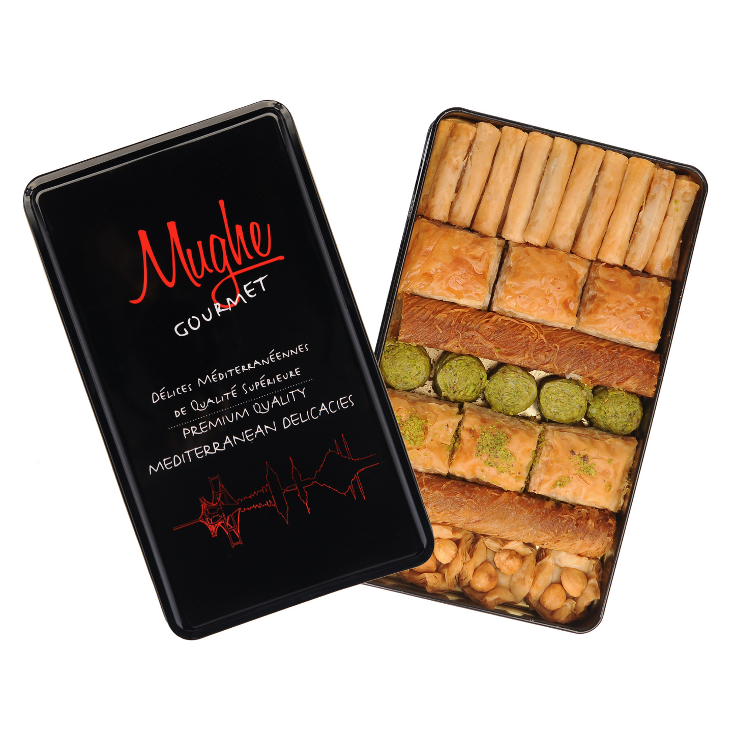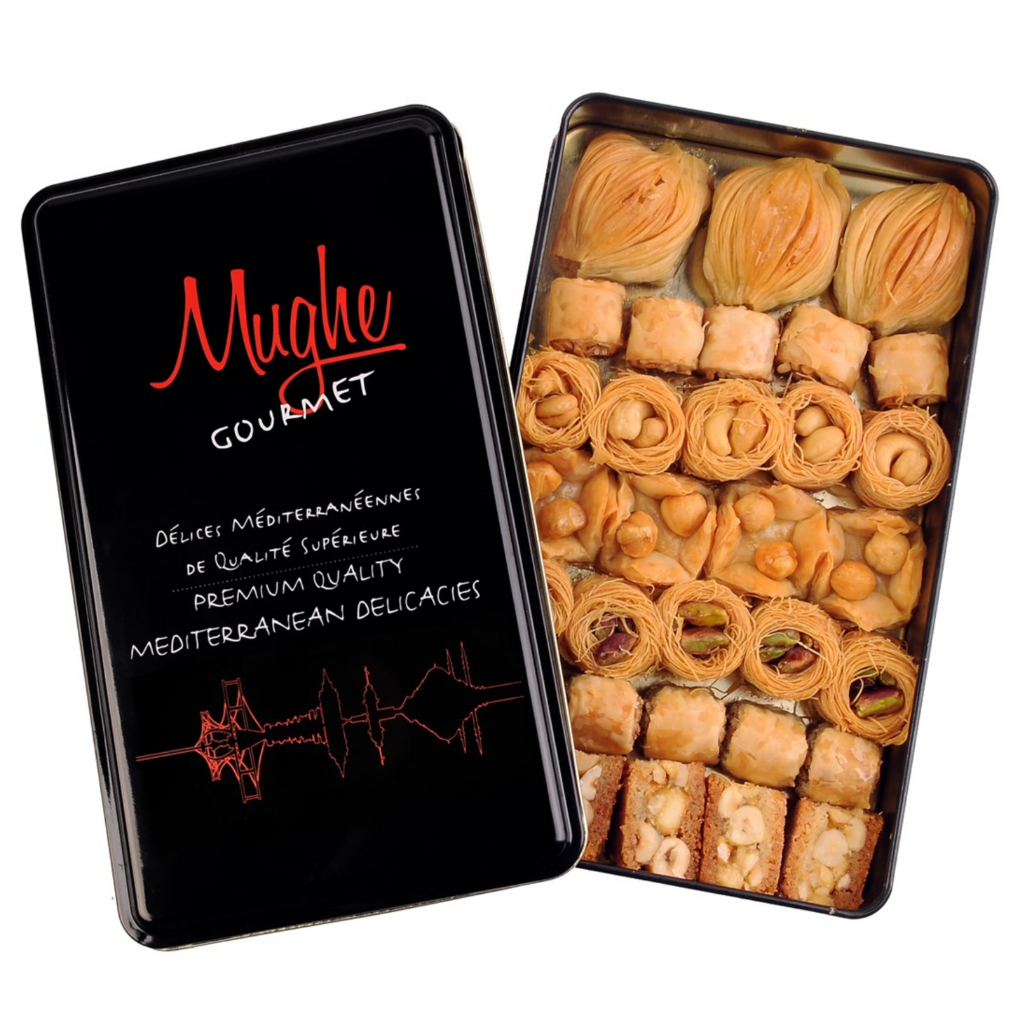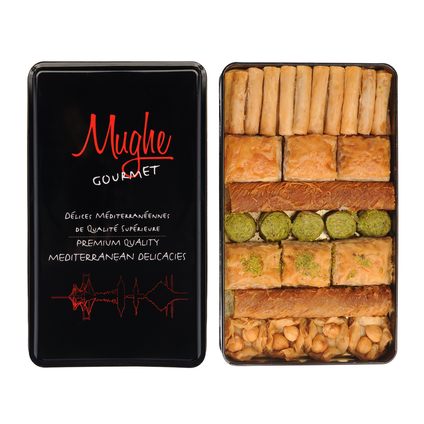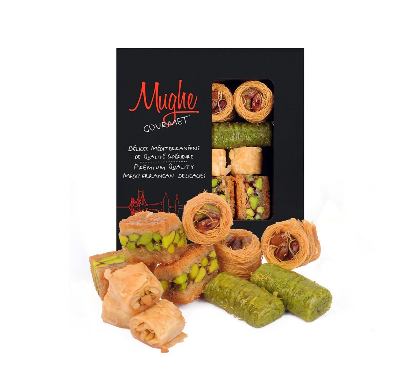 Concedetevi una sfoglia di pasta fillo, generosamente farcita con pistacchi, noci, anacardi o nocciole. Festeggia con gli amici, esalta le vacanze o semplicemente regalati qualcosa: Mughe Gourmet è la tua destinazione baklava online definitiva.