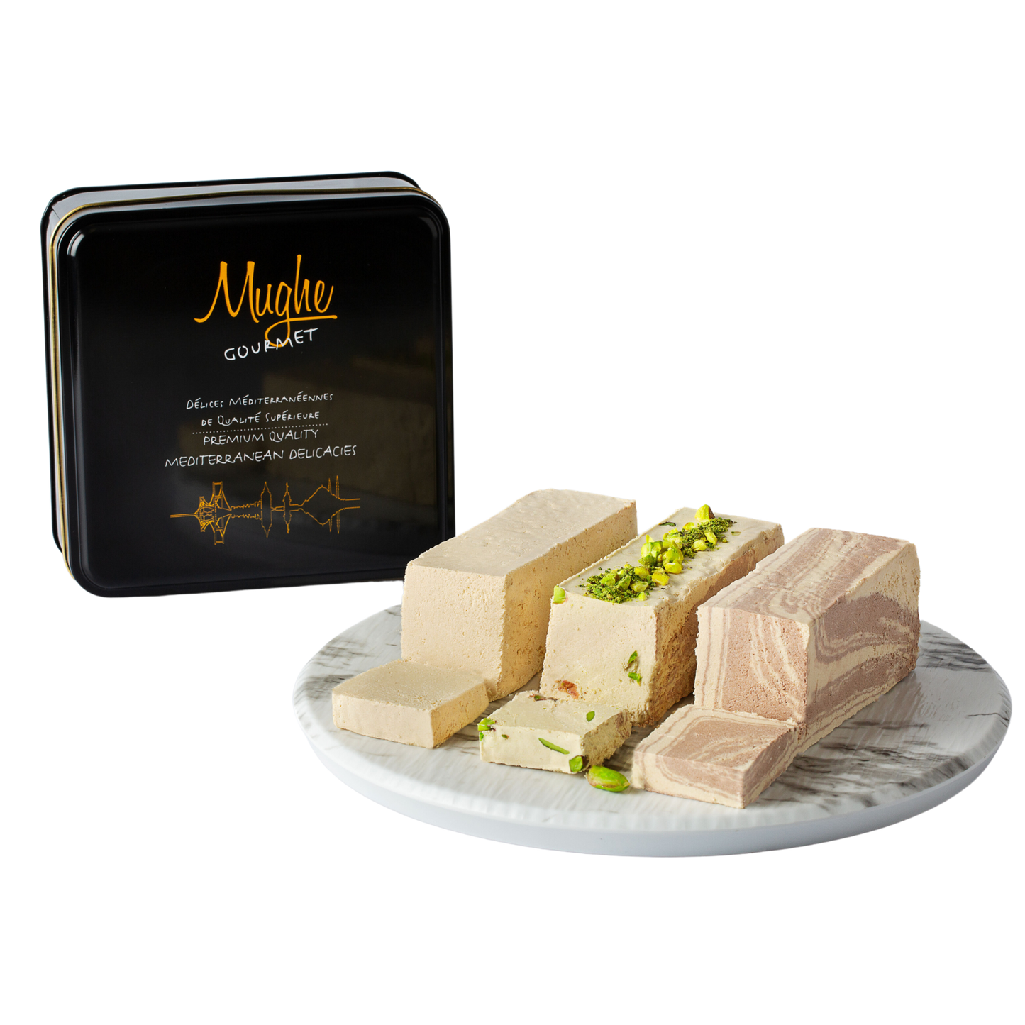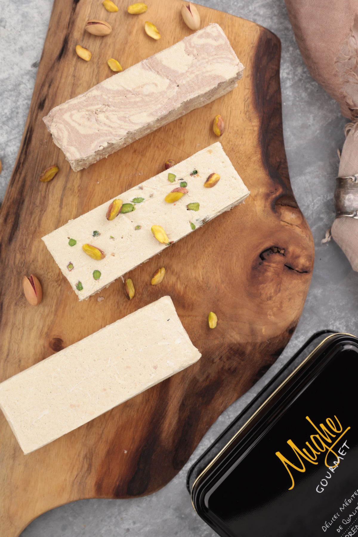 Mughe Gourmet Istanbul: autentica Tahini Halva fatta con amore, ingredienti di prima qualità e sapori unici. Scegli tra pistacchio, cioccolato, noci e altro ancora! Concediti una perfezione che si scioglie in bocca, consegnata velocemente in tutto il mondo! Acquista ora e vivi la magia dei dolci turchi! ✨